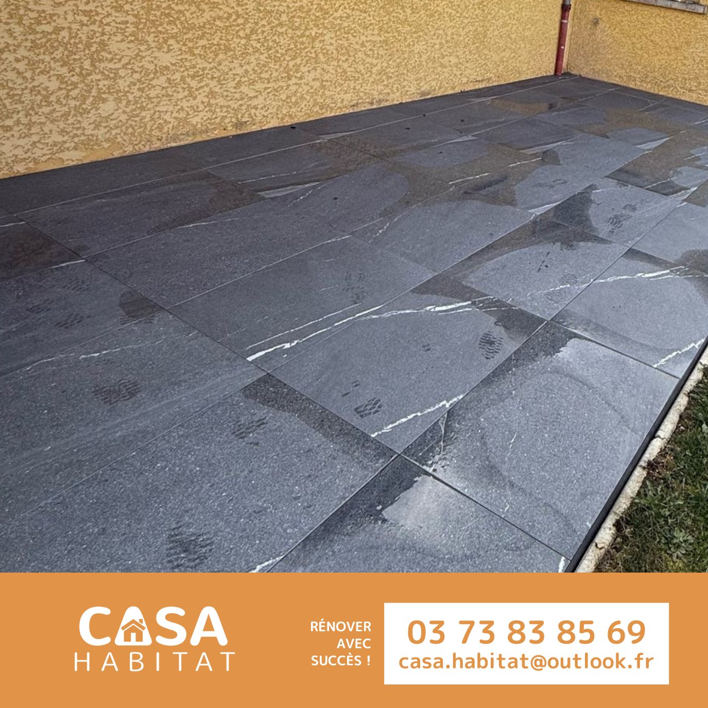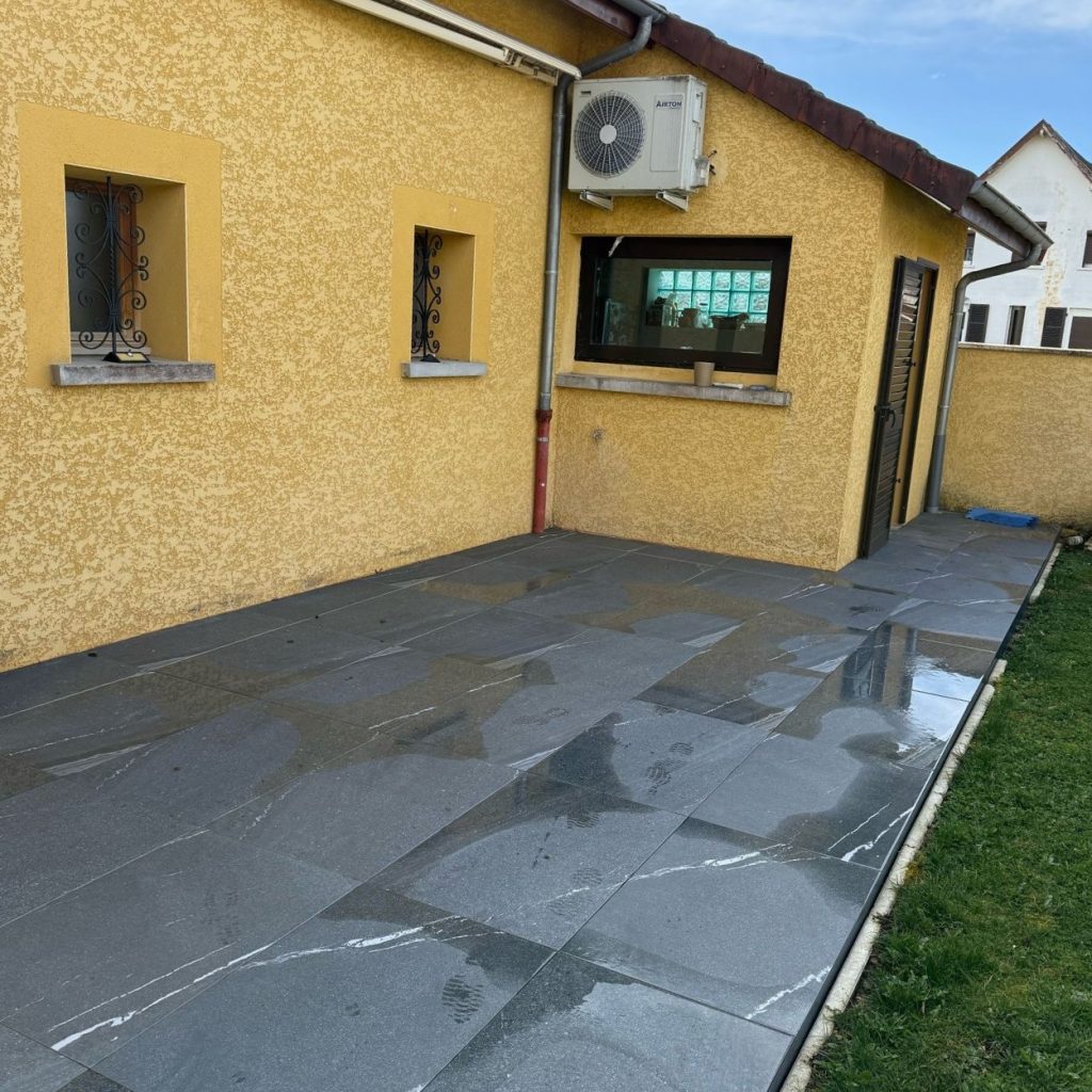 Enfin, des dalles en grès cérame de format 60×90 cm (épaisseur 20 mm) ont été posées avec soin. Ce matériau résistant et esthétique garantit une finition moderne, antidérapante et facile d’entretien.