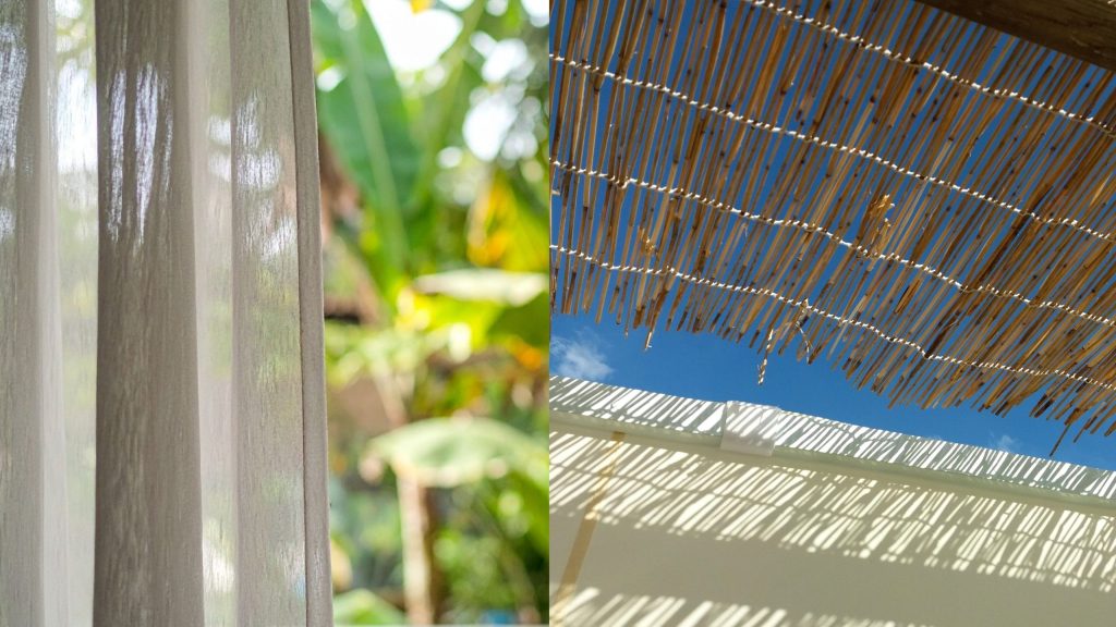 Pour filtrer le soleil tout en créant une ambiance intime et cosy, les rideaux d’extérieur ou les canisses sont une excellente option. Faciles à installer, ils ajoutent une touche décorative tout en offrant une protection modulable contre la lumière et les regards.