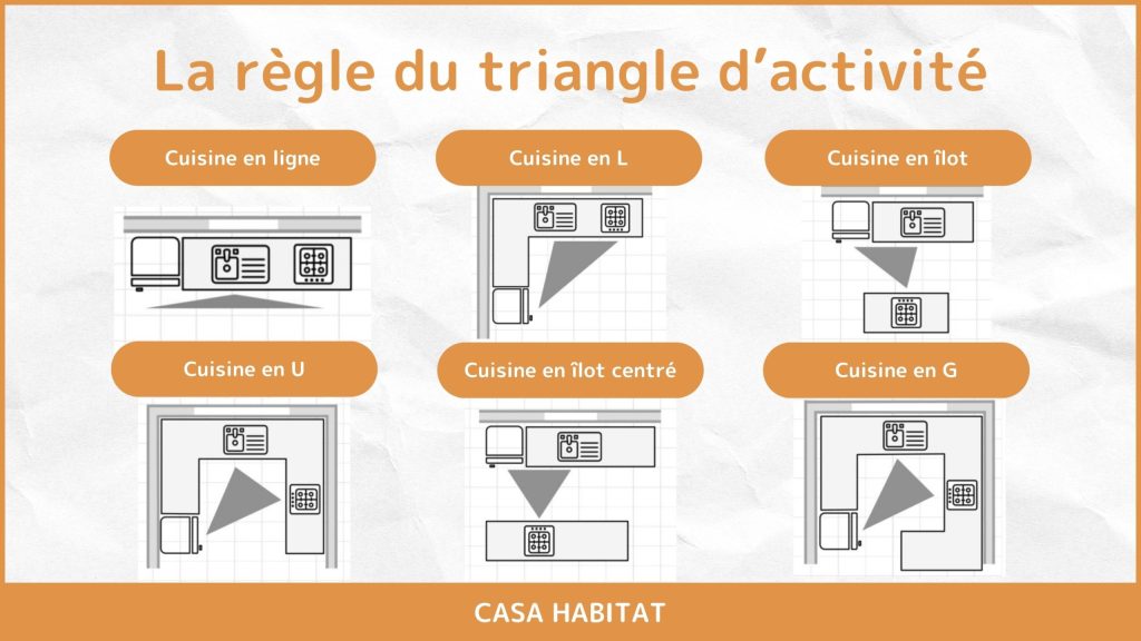 La règle du triangle d’activité est un incontournable dans l’aménagement : il s’agit de placer l’évier, la plaque de cuisson et le réfrigérateur de manière à ce que les déplacements entre ces points soient courts et directs. Cette disposition réduit la fatigue et optimise le temps passé en cuisine.