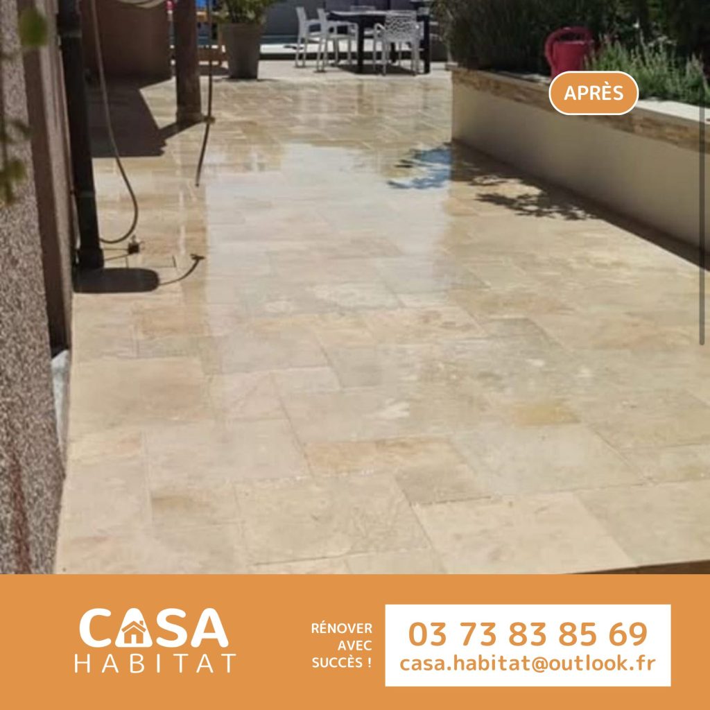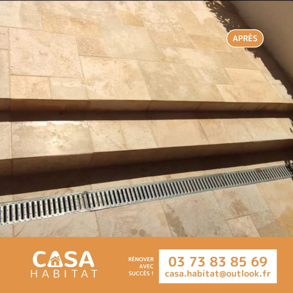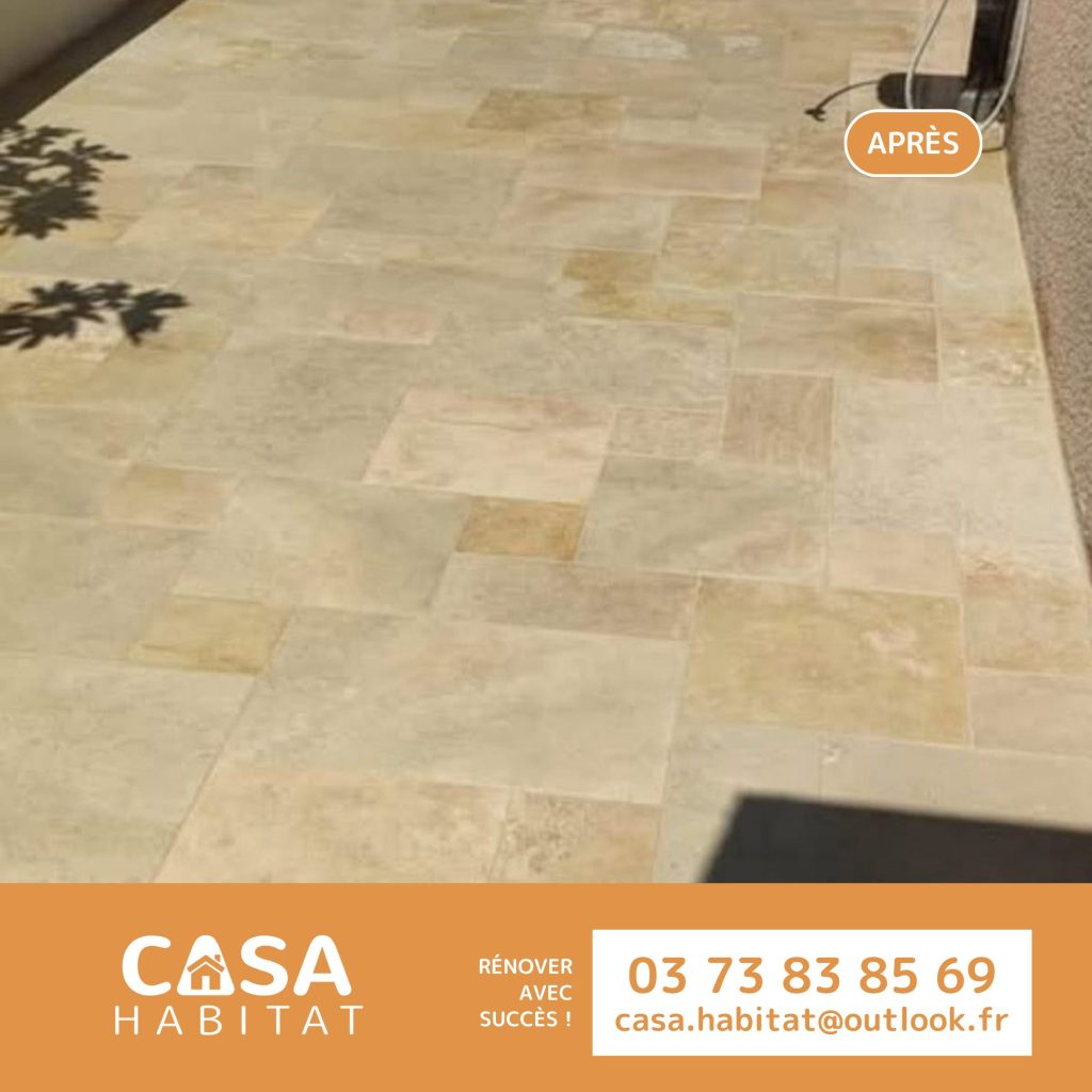 Sur ce chantier, nos équipes ont travaillé sur l’aménagement d’un espace extérieur pour lui donner plus de charme et de confort au quotidien. Le choix du travertin s’est rapidement imposé pour son aspect naturel et chaleureux, parfaitement adapté à une terrasse et aux abords d’une maison. Aujourd’hui, l’ensemble offre un rendu harmonieux, idéal pour profiter des beaux jours.